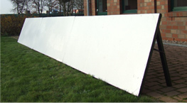 Mit einer Größe von 2,50 m x 1 m verbindet sie hohe Funktionalität und Ästhetik: Die strahlend weiße Vorderseite sorgt für optimale Sichtbarkeit Ihrer Werbebanner, während sich die dunkelgrüne Rückseite harmonisch in die Umgebung integriert.