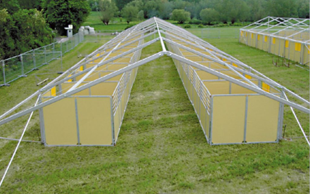 Die Stallzelte von Schafhof Equipts haben eine starke Dachneigung von 24 Grad. Das sorgt für einen optimalen Abfluss von Regenwasser bzw. Schnee und verhindert, dass sich Wasserdellen bilden.