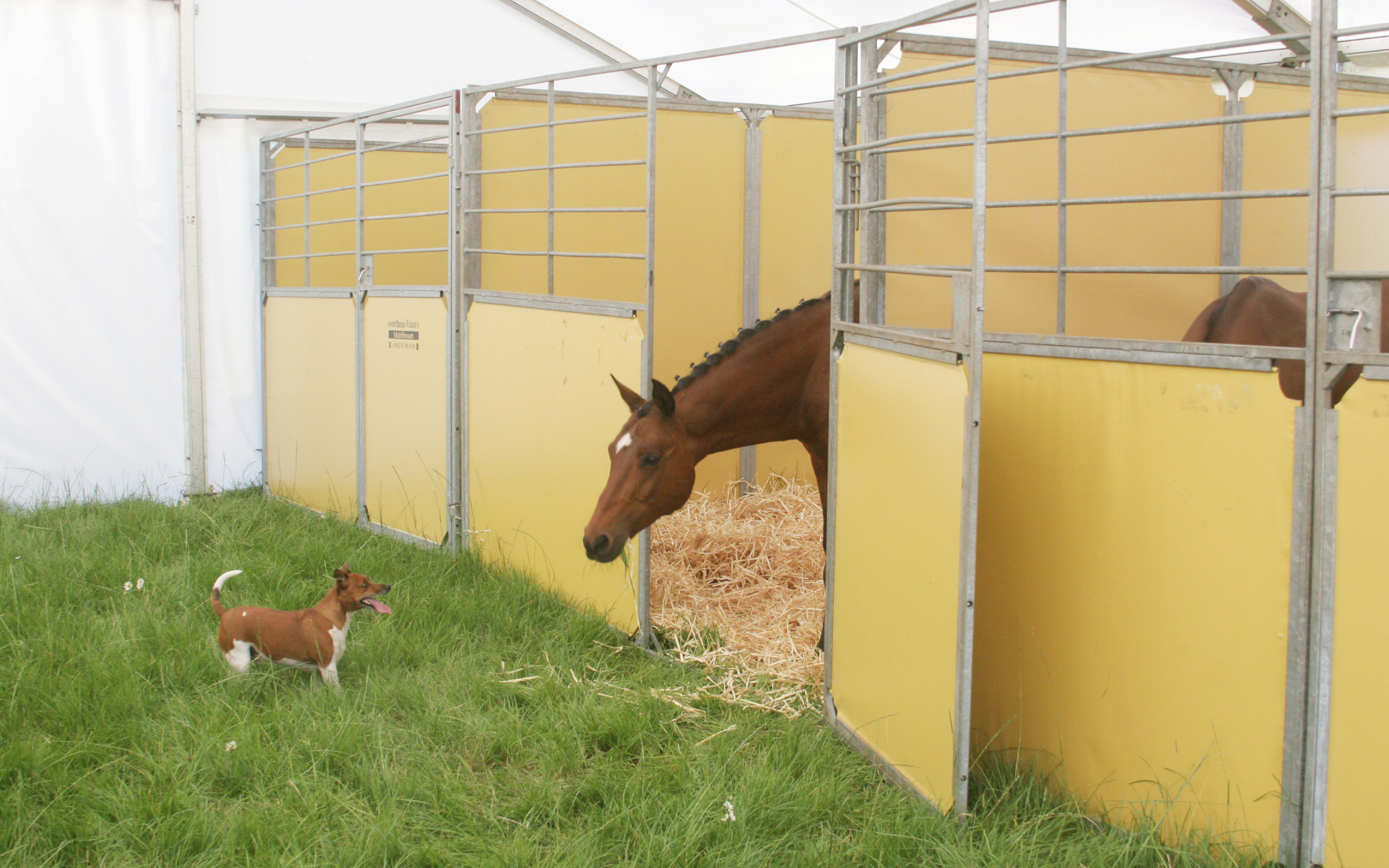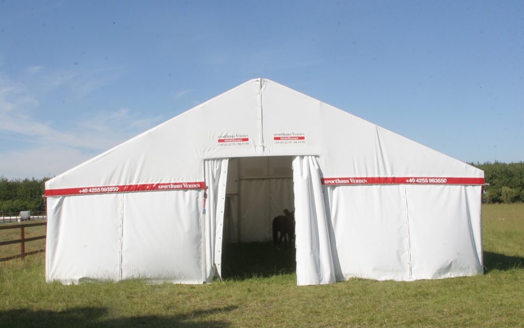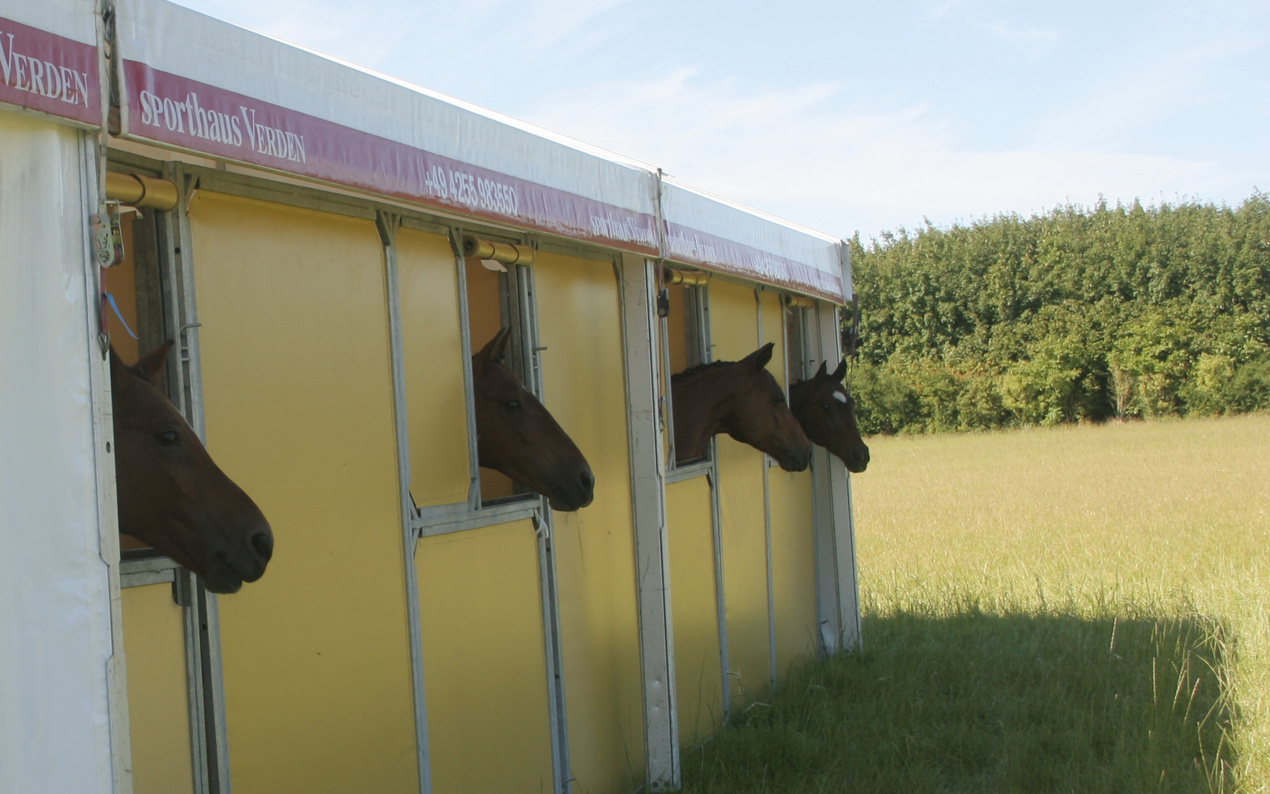 Bei Outdoor-Veranstaltungen gibt es von uns obendrauf noch das passende Stallzelt, immer sauber weiß, immer schick. Es schützt vor Sonne, Wind und Regen und schafft ein zusätzlich sicheres und geschütztes Umfeld für alle vierbeinigen Athleten.