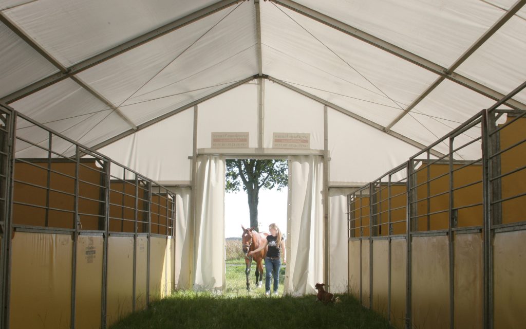 Reiter schätzen unsere geräumigen, 4 m breiten Stallgänge, in denen Sattel- und Futterboxen ganz einfach untergebracht werden können. Portalblenden ermöglichen das Reiten im Zelt, wodurch Ihre Veranstaltung noch komfortabler und professioneller wird.